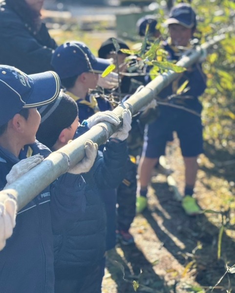 カブスカウトたちは、長い竹をみんなで力を合わせて運び、とんどの立ち上げや藁の編み込み、飾り付けにも挑戦しました。仲間と協力