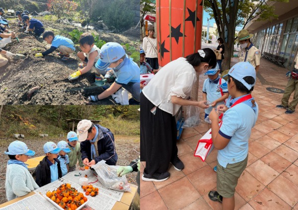 ビーバー隊は、芋ほりしたり、渋柿をとって干し柿を作ったりと「秋の実り」いっぱいの自然を楽しんでいます。人の役にたつ募金もやります。