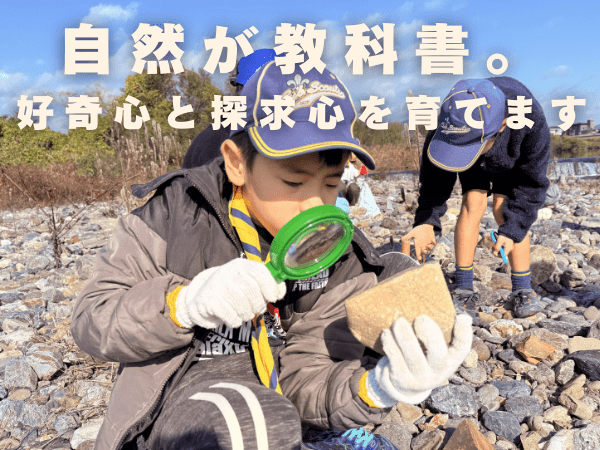 ①自然が教室: 異年齢の仲間と協力し、たくましく生きる力を育みます。
