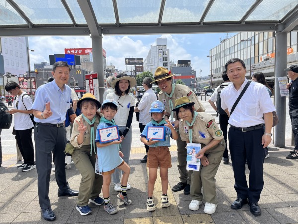 道行く方々からは「青い羽根??」と驚きの声があがりましたが、スカウトたちは臆することなく、この募金が海で遭難された方々の救助活動を支えるボランティアの方々(日本水難救済会)への支援に使われることを、指導者がパンフレットで説明し活動の意義を伝えると、快く募金に応じてくださる方が多数いらっしゃいました。この活動は、遠い海での人命救助という社会貢献を通じて、スカウトたちが地域社会との繋がりと奉仕の心を強く実感する貴重な機会となりました。