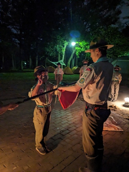 夜の帳(とばり)が降りた静寂の中、炎を囲んで行われるその式典は、これからボーイスカウトとして頑張る決意に満ち溢れたスカウトたちの心を、より一層引き締めます