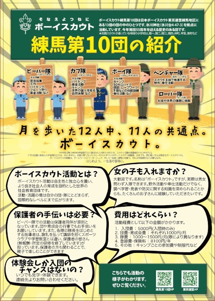 練馬第10団は、地域の子どもたちをより良き社会人に育てようと始めた活動が、現在にまで受け継がれている歴史ある団です。